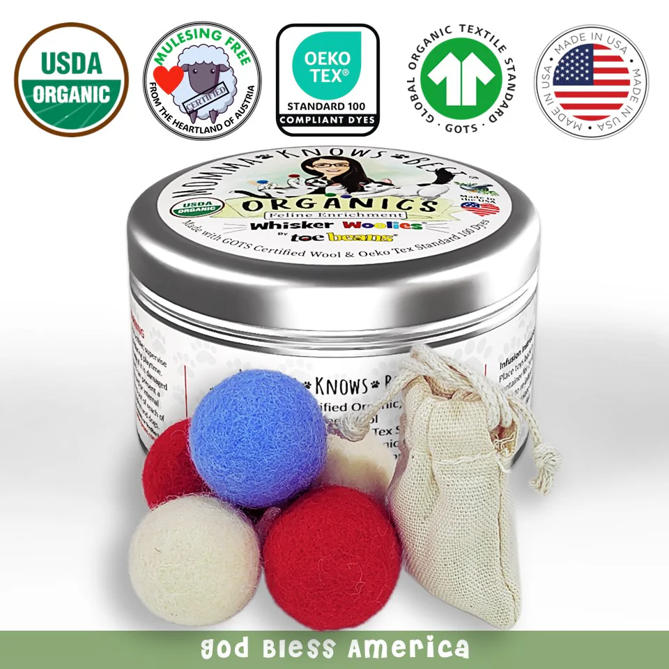 Think "felted wool cat toys" means cheap overseas manufacturing, forced labor camps, synthetic blends, heavy-metal contamination, hormone-disrupting AZO dyes, or animal cruelty? Think again!